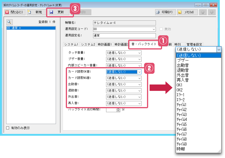 ・カード読取OK音・・・カード読込み時に正常に読込めた場合に鳴らす音を設定します。