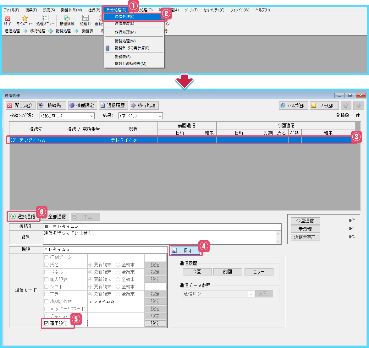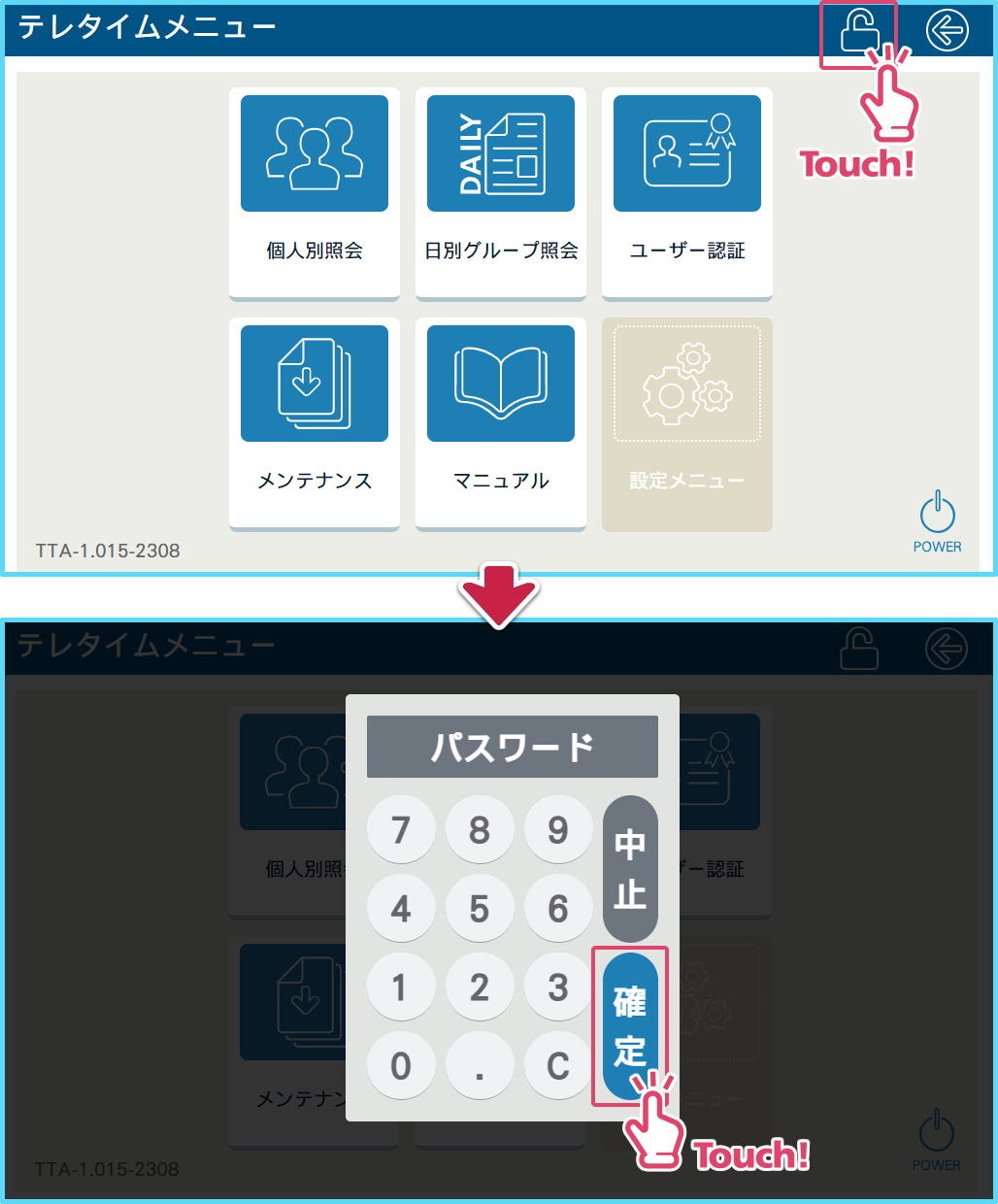打刻漏れを通知することはできますか 以下の操作で、前回の出勤または退勤打刻が抜けている場合、カード読み取り時に通知をすることができます。 ▼ テレタイムαの場合クロノスPerformanceで設定する場合[設定]→[通信機種の設定]で「テレタイムα」を選択して「運用設定」ボタンをクリックします。「システム1」タブの出退勤打刻エラー処理を「する」に設定して、「更新」ボタンをクリックします。[日常処理]→[通信処理]で該当のタイムレコーダーを選択し「保守」ボタンをクリックします。通信モード内に「運用設定」が表示されますので、チェックを入れます。「選択通信」ボタンをクリックして通信を行ってください。タイムレコーダーで、設定が反映されたかご確認ください。テレタイムで設定する場合「メニュー」をタッチします。マスターカードをかざします。※マスターカードがない場合は、「ロックアイコン」をタッチするとテンキーを表示しますので、パスワードを入力して、「確定」をタッチしてください。「設定メニュー」をタッチします。システムをタッチします。「出退勤打刻エラー処理」をタッチし、「する」を選択します。右上の「←」をタッチし時計画面に戻ります。▼ テレタイムα-Xの場合テレタイムα-Xは打刻漏れの通知を行うことはできません。 ▼ 機種が不明な場合ご利用のテレタイムがテレタイムαとテレタイムα-Xのどちらか不明な場合テレタイムから確認いただくことができます。テレタイム右列にある[メニュー]をタッチして、ご確認ください。テレタイムαの場合以下に当てはまる場合は「テレタイムα」です。・画面左下のバージョンの末尾4桁が数字になっている。テレタイムα-Xの場合以下に当てはまる場合は「テレタイムα-X」です。・画面左下のバージョンの末尾が「-X」となっている。