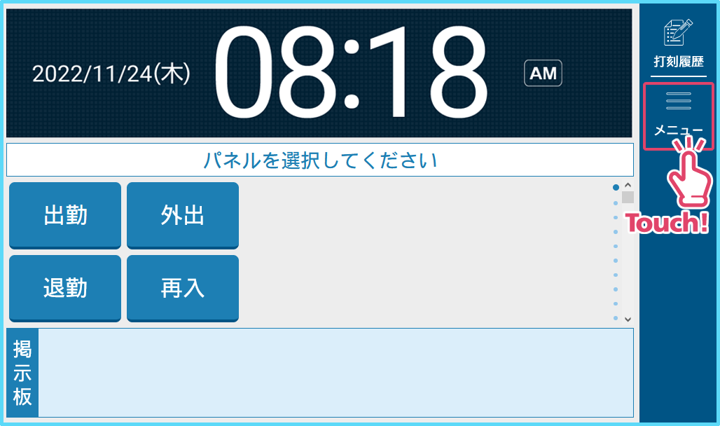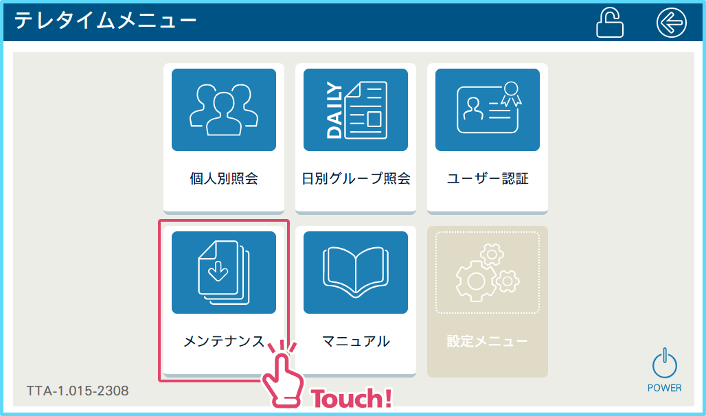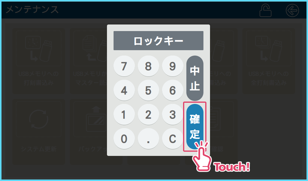 - ※マスターカードがない場合は、「ロックアイコン」をタッチするとテンキーを表示しますので、パスワードを入力して、「確定」をタッチしてください。