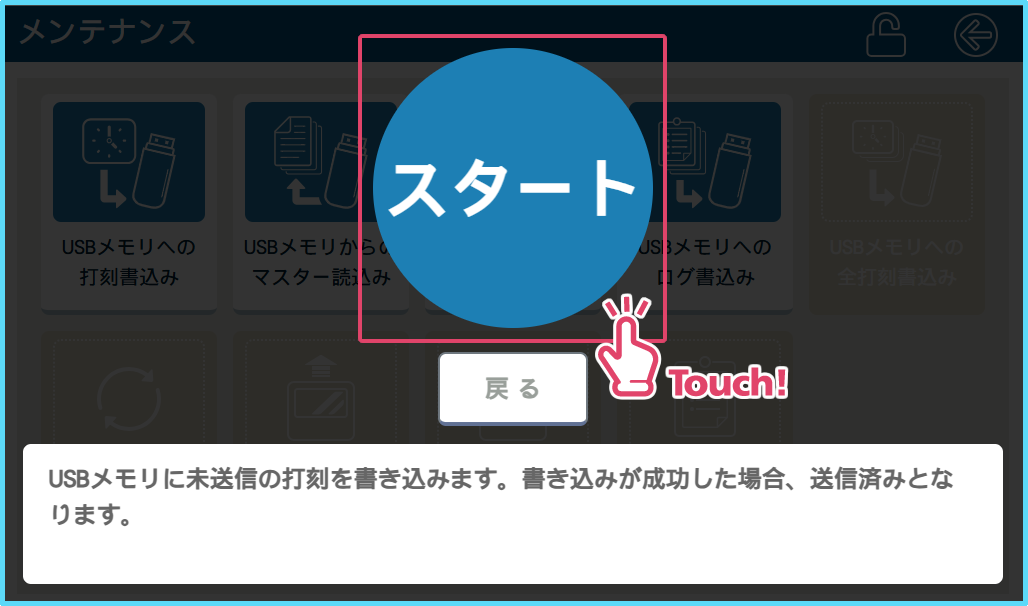 - 「USBメモリへの打刻の書込み」をタッチしてから、「スタート」をタッチしてください。