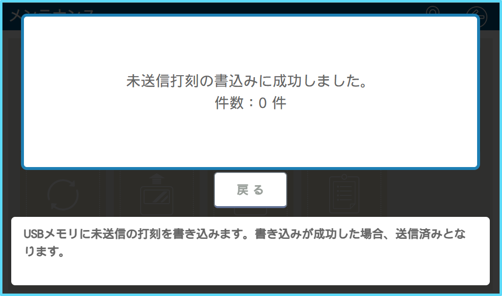 - 成功すると、「未送信打刻の書き込みに成功しました。」と表示されますので、「戻る」をタッチします。