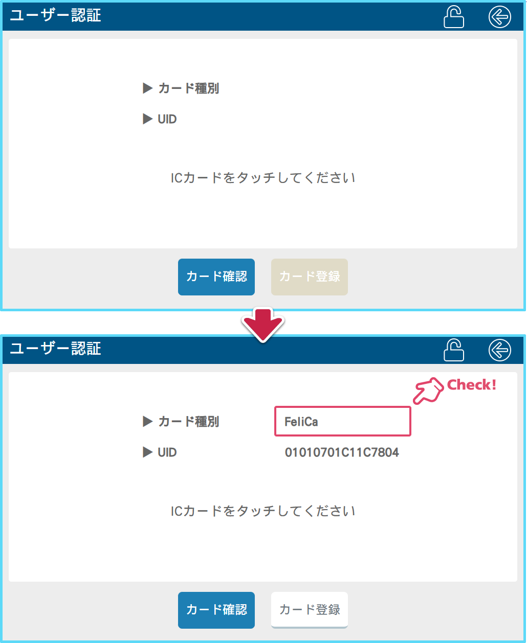 - 手元にあるカードをかざすとカード種別に「FeliCa」または「Mifare」が表示されます。