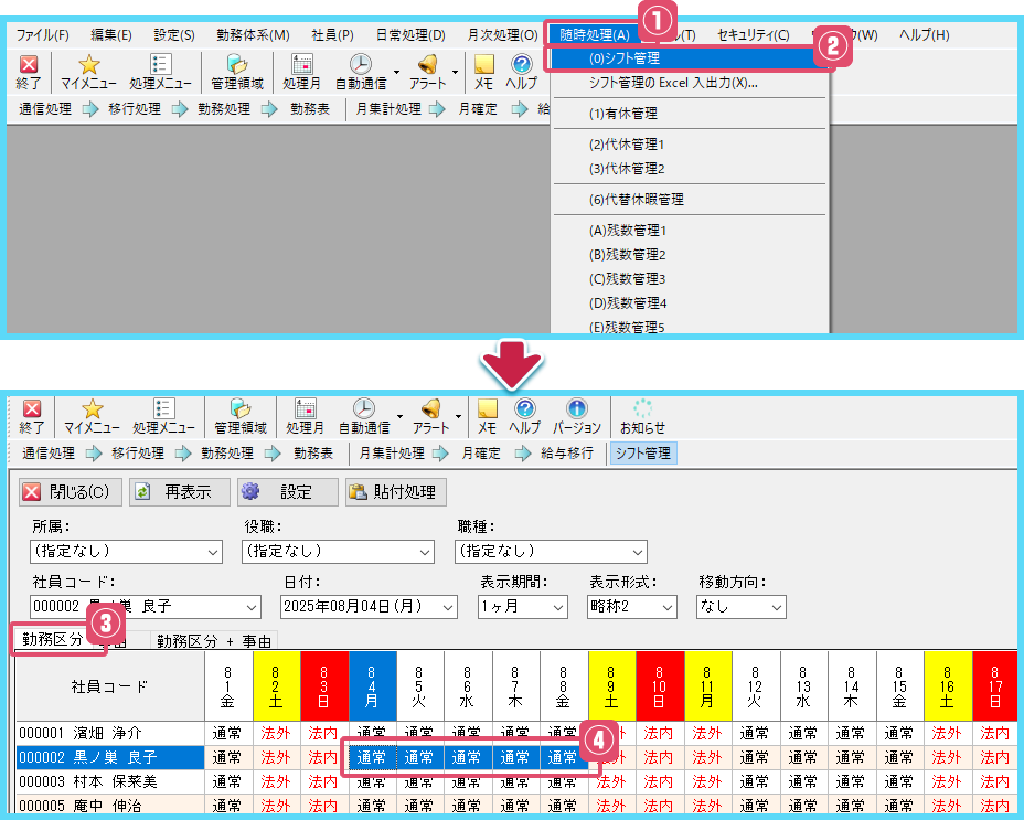 勤務区分や事由を一括で変更することはできますか 以下の操作で勤務区分や事由を一括で変更することができます。[随時処理]→[シフト管理]を開きます。「勤務区分」タブ、もしくは「事由」タブで変更したいセルをドラッグで選択します。選択状態のセルの上で右クリックし、変更したい勤務区分や事由を選択します。※事由は「事由1」に反映します。すでに「事由1」に事由を入力している場合は、上書きになるためご注意ください。