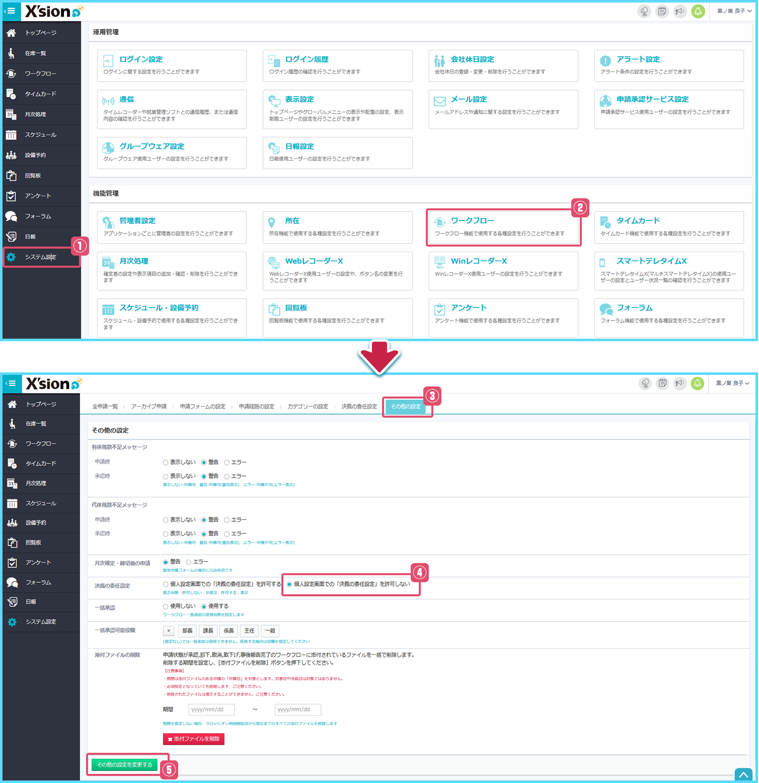 [個人設定]の[決裁の委任設定]を非表示にすることはできますか 以下の設定で、[個人設定]の[決裁の委任設定]を非表示にすることができます。[システム設定]→[ワークフロー]→[その他の設定]タブの「決裁の委任設定」で、「個人設定画面での「決裁の委任設定」を許可しない」にチェックを入れてください。