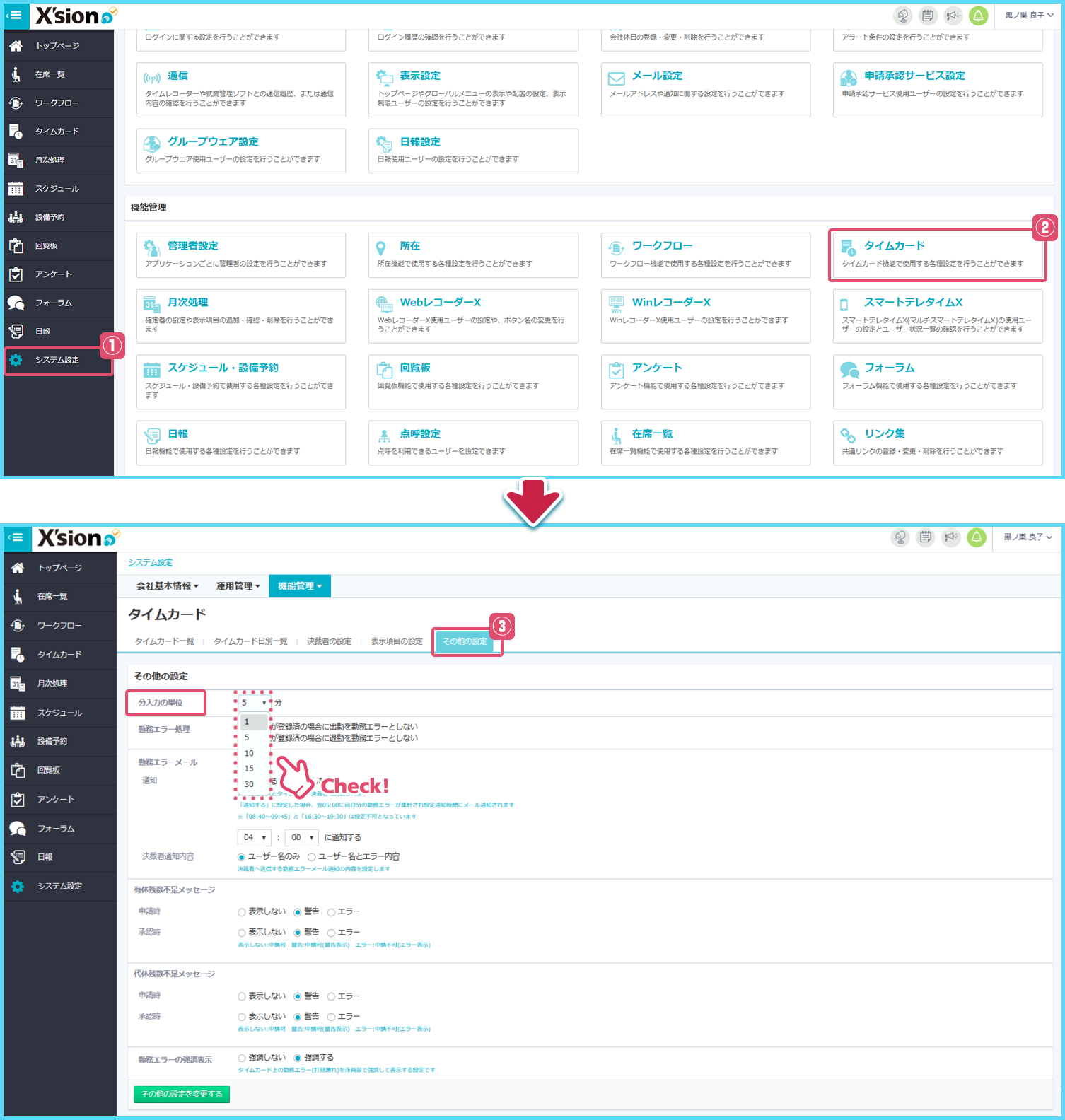 タイムカードの分入力の単位を変更することはできますか 以下の設定で、タイムカードの分入力の単位を変更することができます。[システム設定] → [タイムカード] → [その他の設定] タブ の「分入力の単位」から設定ができます。
