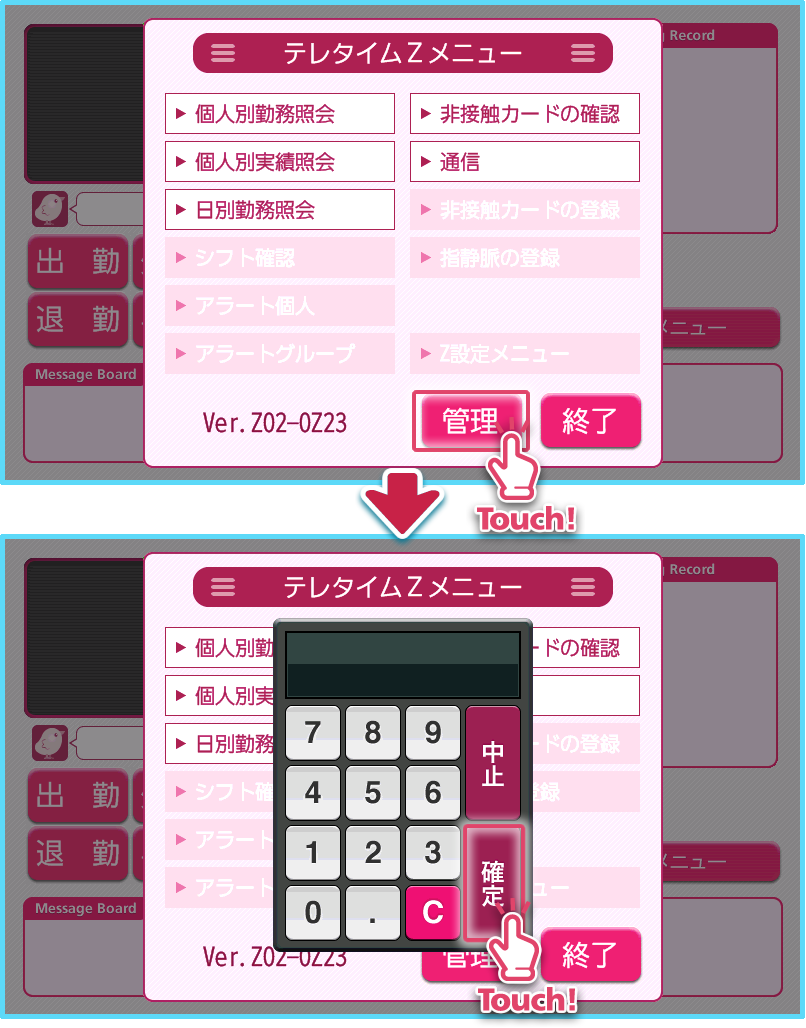 ネットワークの設定を確認する方法を教えてください ▼テレタイムZの場合「メニュー」をタッチします。マスターカードをかざします。※マスターカードがない場合は、「管理」をタッチするとテンキーを表示しますので、パスワードを入力して、「確定」をタッチしてください。「Z設定メニュー」をタッチします。「通信設定」をタッチします。・有線LAN接続の場合 以下の枠線内の設定をご確認ください。・無線LAN接続の場合 以下の枠線内の設定をご確認ください。 また、「無線LAN設定」をタッチしてSSID・セキュリティキーをご確認ください。▼ テレタイムZ-Xの場合「メニュー」をタッチします。マスターカードをかざします。※マスターカードがない場合は、「管理」をタッチするとテンキーを表示しますので、パスワードを入力して、「確定」をタッチしてください。「Z設定メニュー」をタッチします。「通信設定」をタッチします。・有線LAN接続の場合 以下の枠線内の設定をご確認ください。・無線LAN接続の場合 以下の枠線内の設定をご確認ください。 また、「無線LAN設定」をタッチしてSSID・セキュリティキーをご確認ください。※プロキシ環境でZ-Xをご利用中の場合は、「プロキシ設定」をご確認ください。 ▼ 機種が不明な場合ご利用のテレタイムがテレタイムZとテレタイムZ-Xのどちらか不明な場合 テレタイムから確認いただくことができます。 テレタイムの[メニュー]をタッチし、表示されるのメニューバーをご確認ください。テレタイムZの場合テレタイムZ-Xの場合