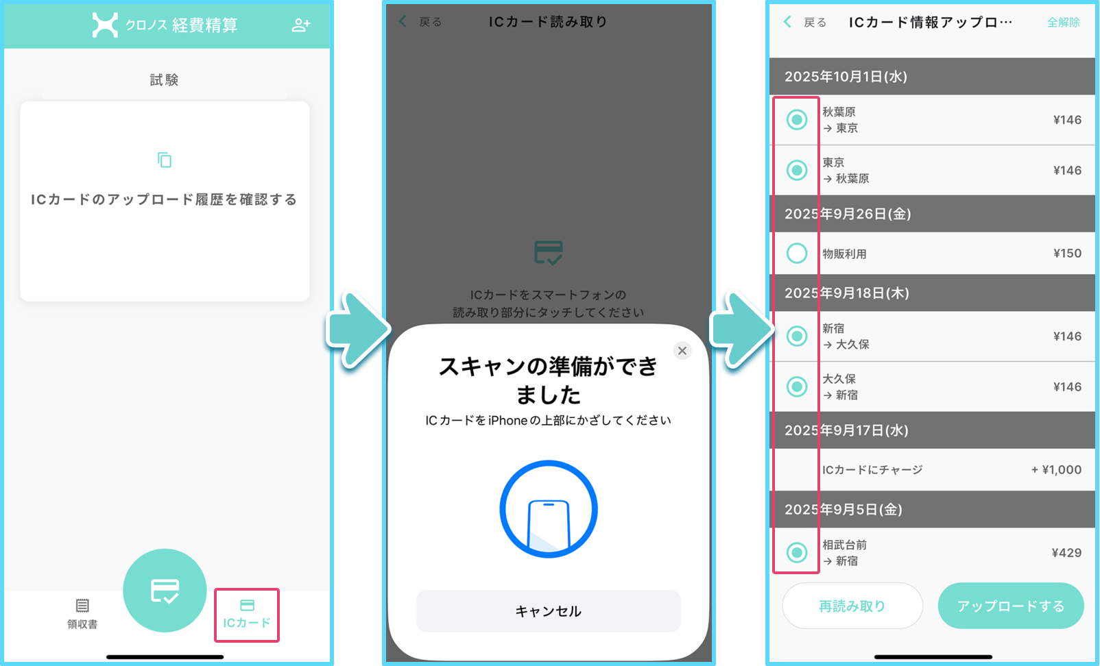 スマートフォンアプリ「クロノス経費精算」を利用してICカードの読み取りをすることができるようになりました。