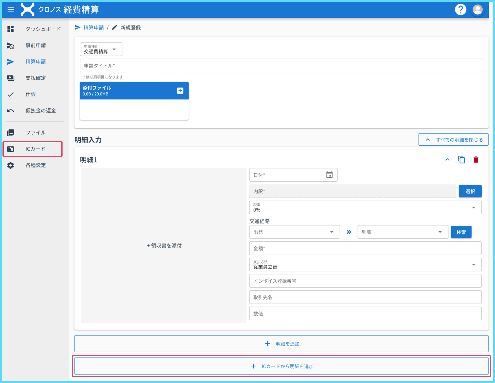 アップロードしたデータは新規申請をする際に「+ ICカードから明細を追加」ボタンから選択することができます。