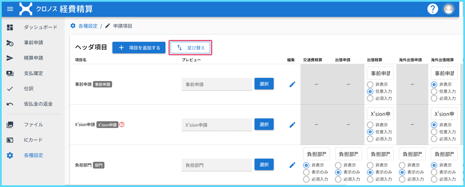 各種設定>申請項目に「並び替え」ボタンを追加しました。