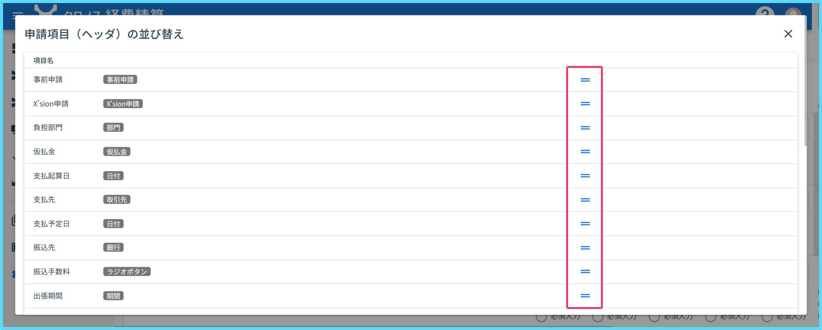 表示されたウィンドウ内で、各項目の「=」をドラッグして移動することで並べ替えが行われます。