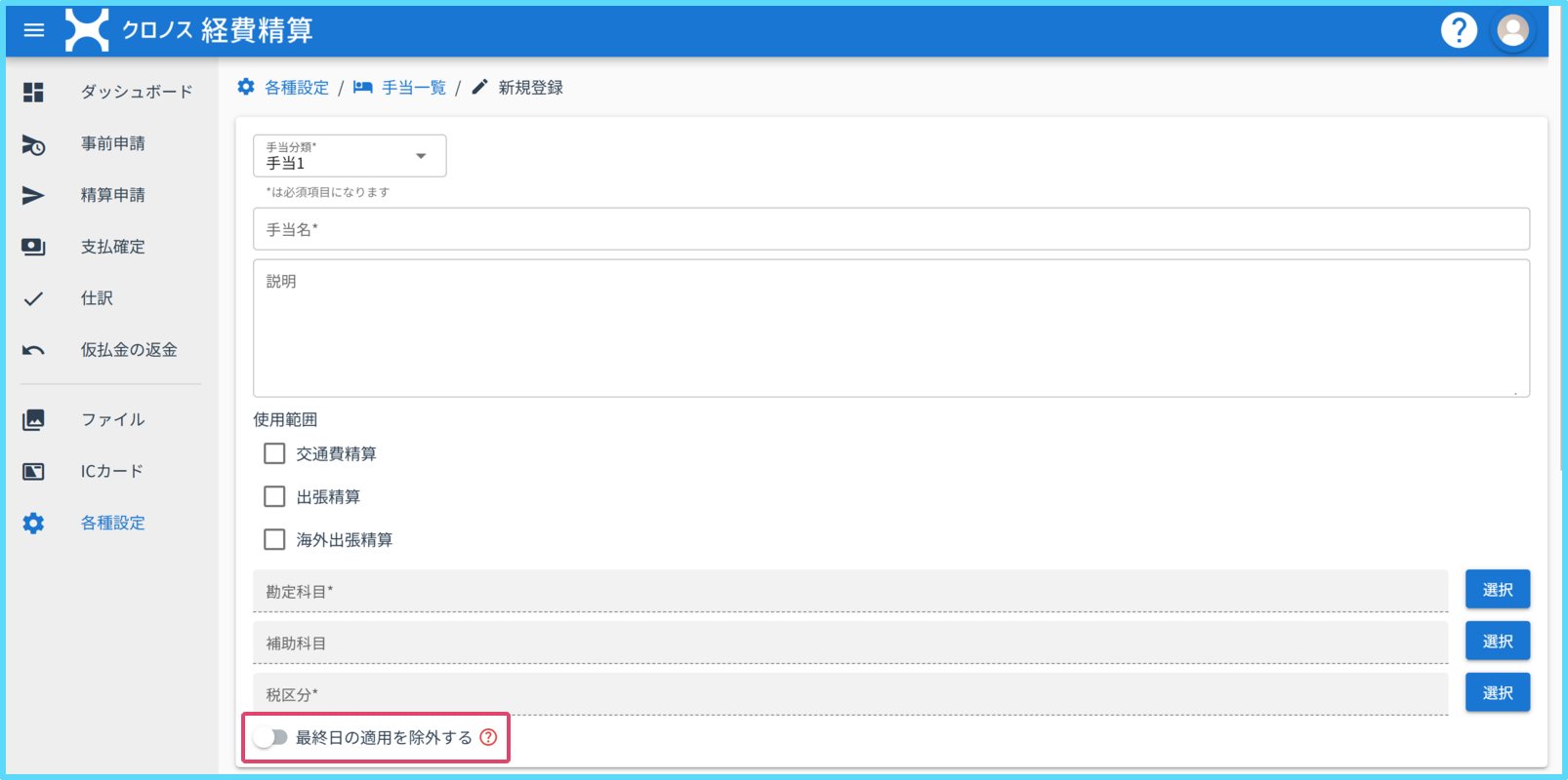 各種項目>手当より手当の登録をするとき、「最終日の適用を除外する」機能を追加しました。