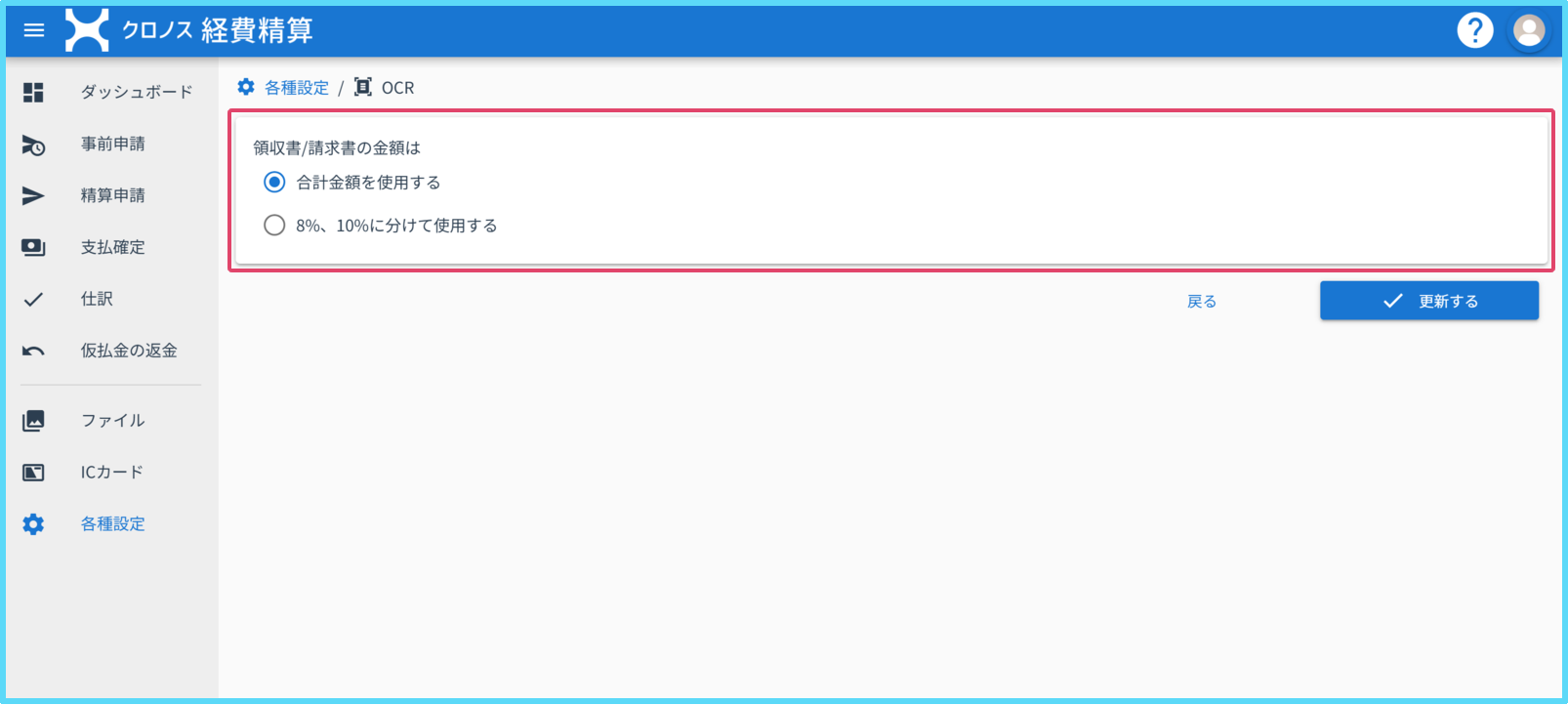 このメニューでは取り込んだ領収書/請求書について、金額をどのように読み取るか選択することができます。