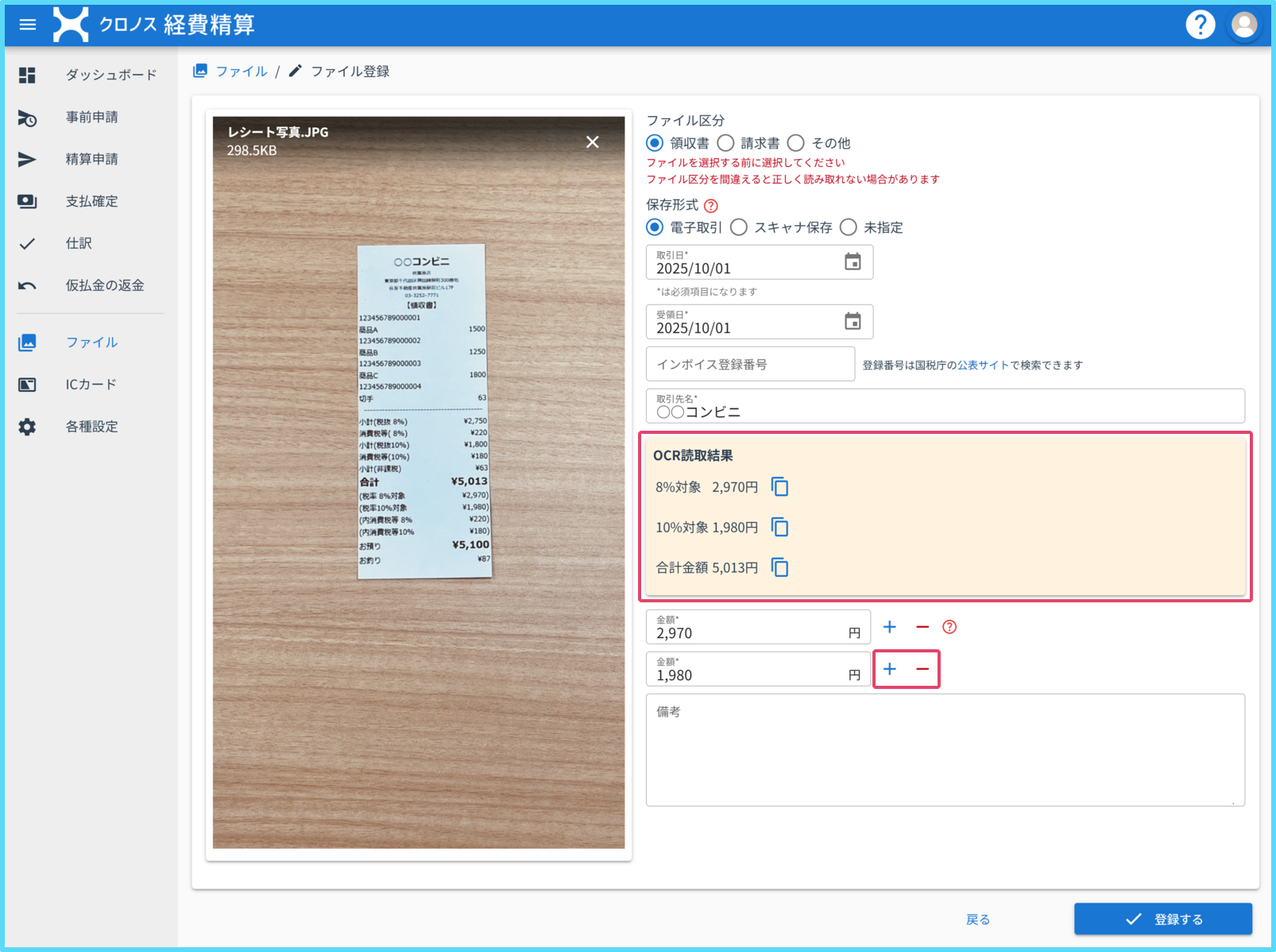 「8%、10%に分けて使用する」設定で、「ファイル」から領収書をアップロードしたとき、画像のように税率ごとに金額が分かれて表示されます。