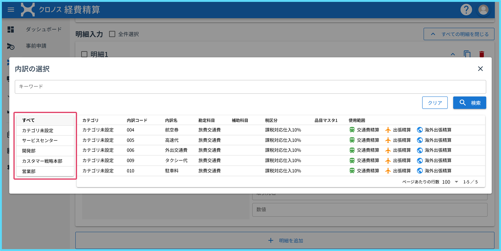 登録したカテゴリは事前申請および精算申請の明細入力画面にも反映されます。