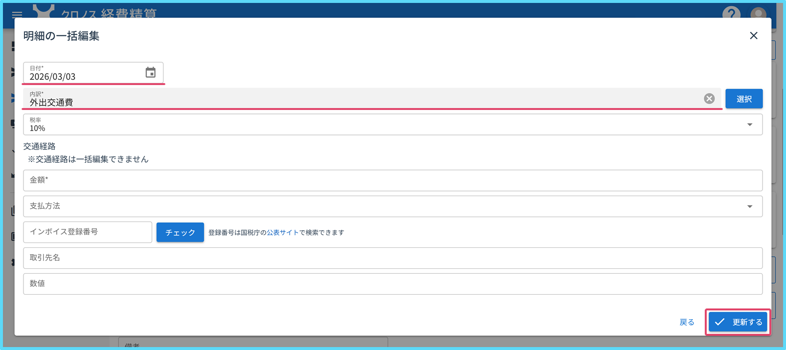 この一括編集ではあらかじめ選択されている「交通経路」に対して編集を行うことはできかねますのでご注意ください。